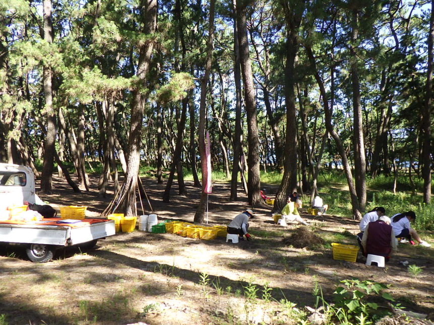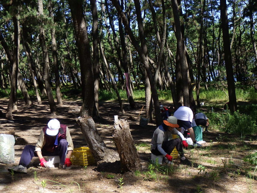 毎週火曜日の朝に虹の松原内に増えすぎて困っている植物を「根っこ」や「球根」から人の手で丁寧に除去する活動です。