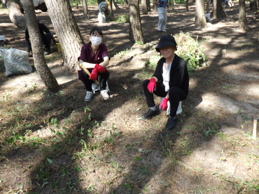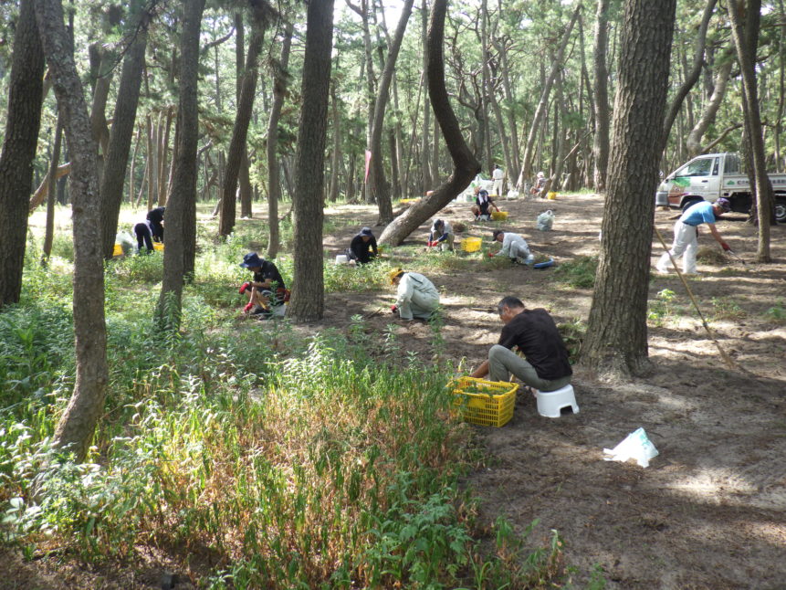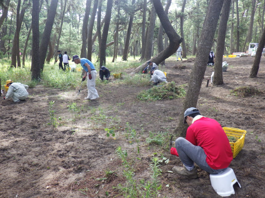 毎週火曜日の朝に虹の松原内に増えすぎて困っている植物を「根っこ」や「球根」から人の手で丁寧に除去する活動です。