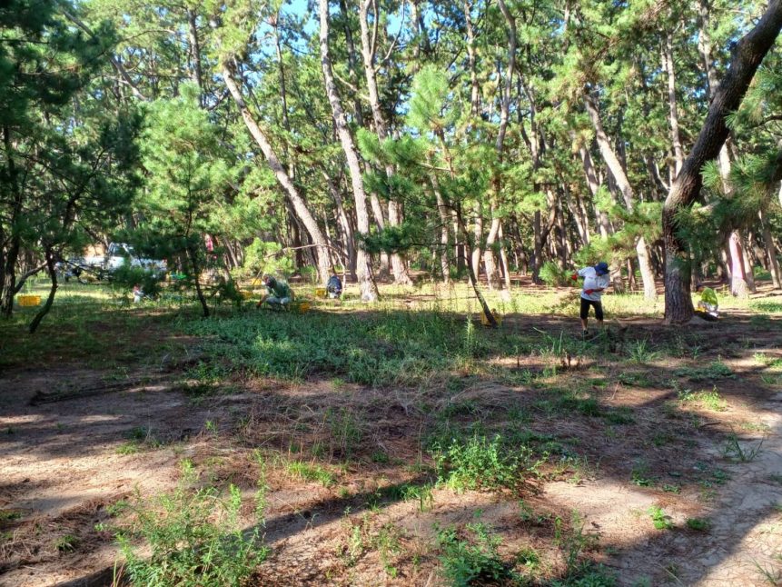 毎週火曜日の朝に虹の松原内に増えすぎて困っている植物を「根っこ」や「球根」から人の手で丁寧に除去する活動です。