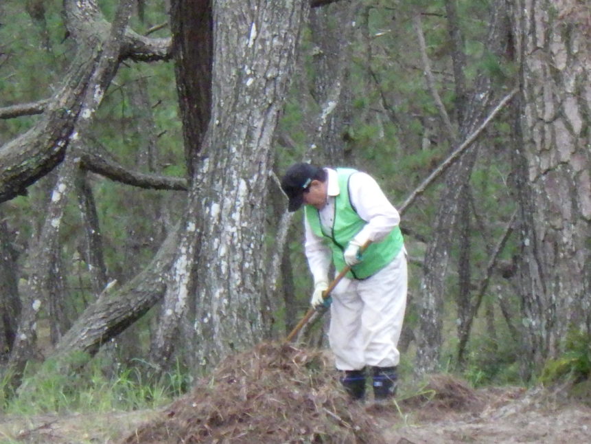 天気予報では、雨の予報でしたが、降ったのはほんの小雨程度。青空こそ見えませんでしたが、小雨の中でもしっかりそれぞれが道具を手に草抜きや松葉かきに汗を流しました。