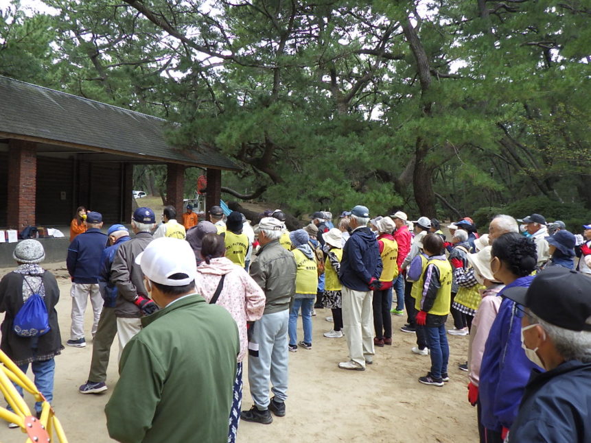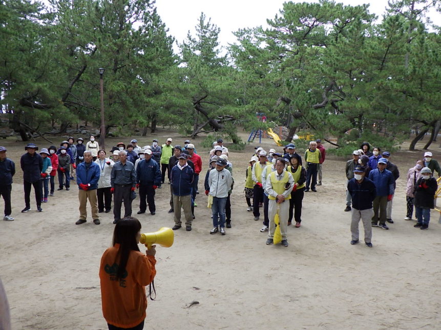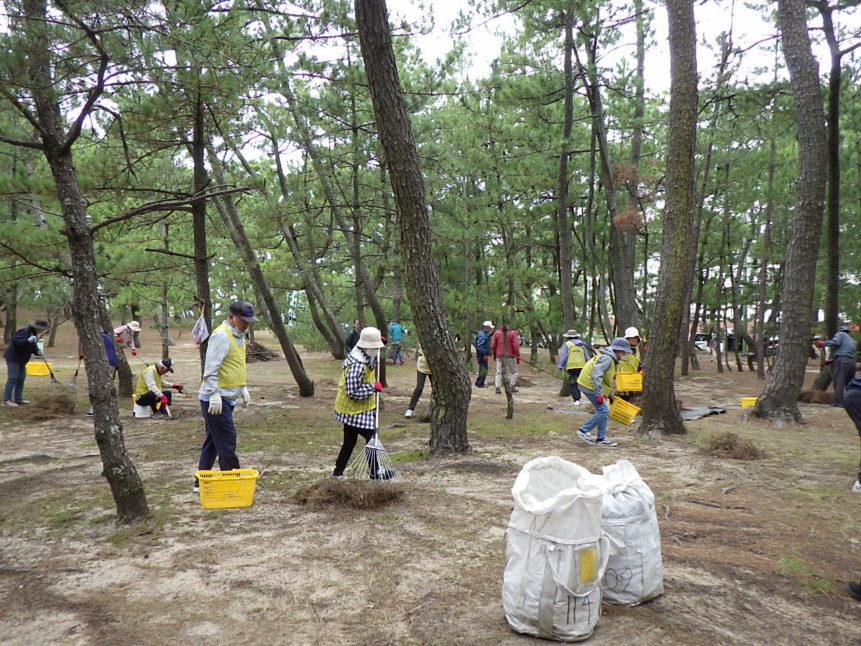 皆さんは声を掛け合いながら、笑顔で楽しそうに作業されていて、その姿にとても励まされました。おかげさまで松原は一段ときれいになり、白砂青松の景観にまた一歩近づきました。
