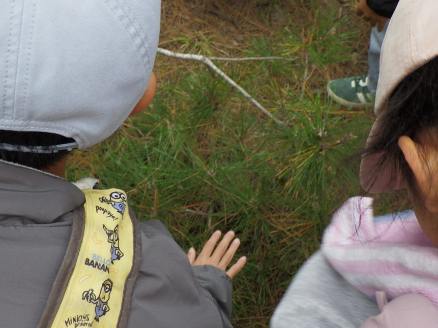 いろんな形の松の木を見たり、「自分と同じ年の松の木を探そう!」とチャレンジしたり。細くて小さな松の木を見て「これがみんなと同じ年の松の木だよ」と伝えると、みんなびっくり!