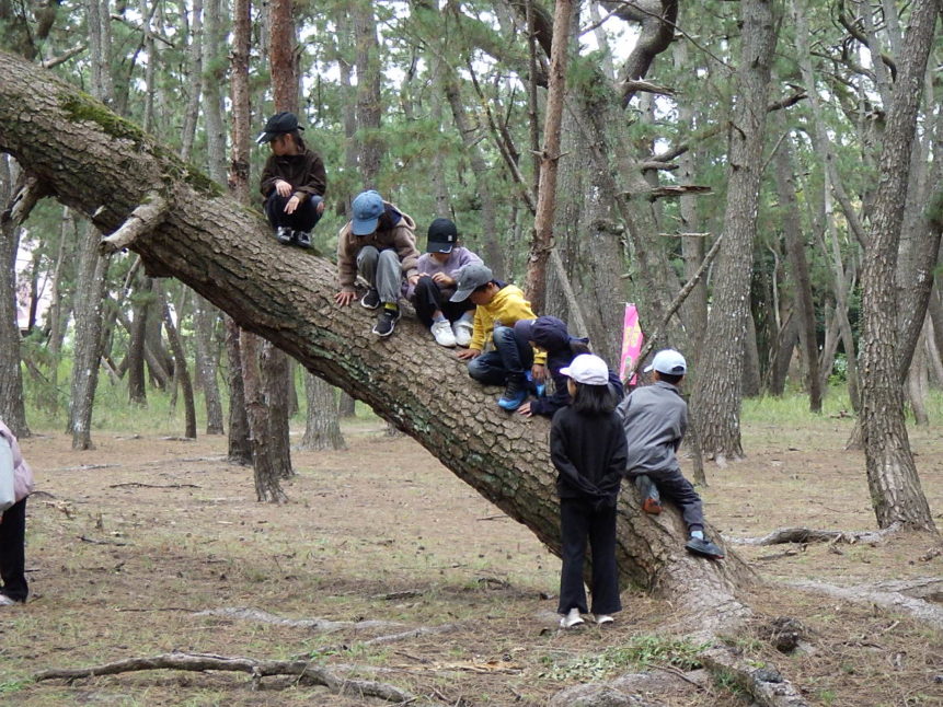その後は東の浜へ。虹の松原の中間地点の見つけ方を聞いたり、砂浜から松原を見渡して、その広さに「わぁ〜!」と驚いていました。休憩時間には、松の木に登ったり、自由に散策したりと、のびのび楽しむ姿が印象的でした。