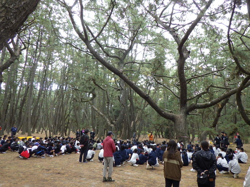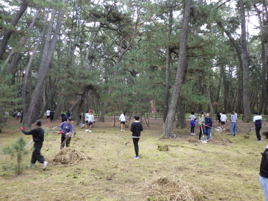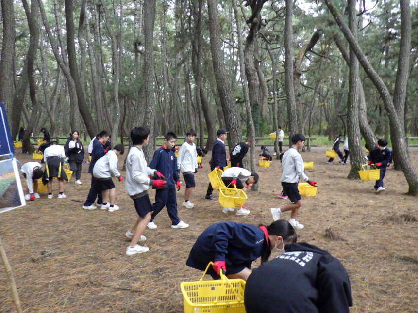 11月27日(木)、浜玉中学校(1年生)、浜崎小学校(6年生)、玉島小学校(6年生)、平原小学校(6年生)のみなさん、あわせて約280人が虹の松原の保全活動に参加してくれました✨