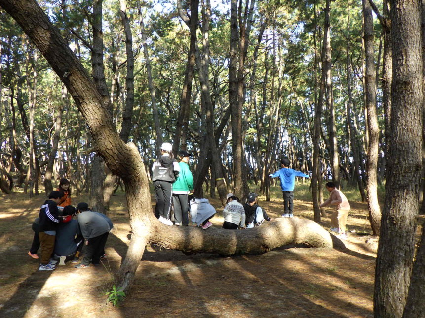 自由時間には松原を走り回ったり、松の木に登ったり、みんな笑顔いっぱいで楽しんでいました。