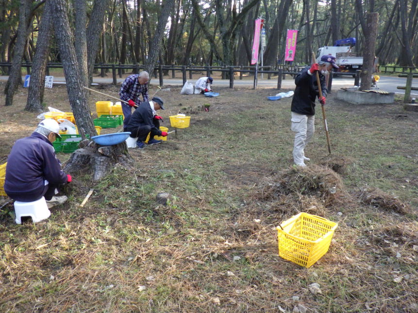 毎週火曜の朝、虹の松原で増えすぎた植物を根から丁寧に取り除き、未来の松原を守る活動です。