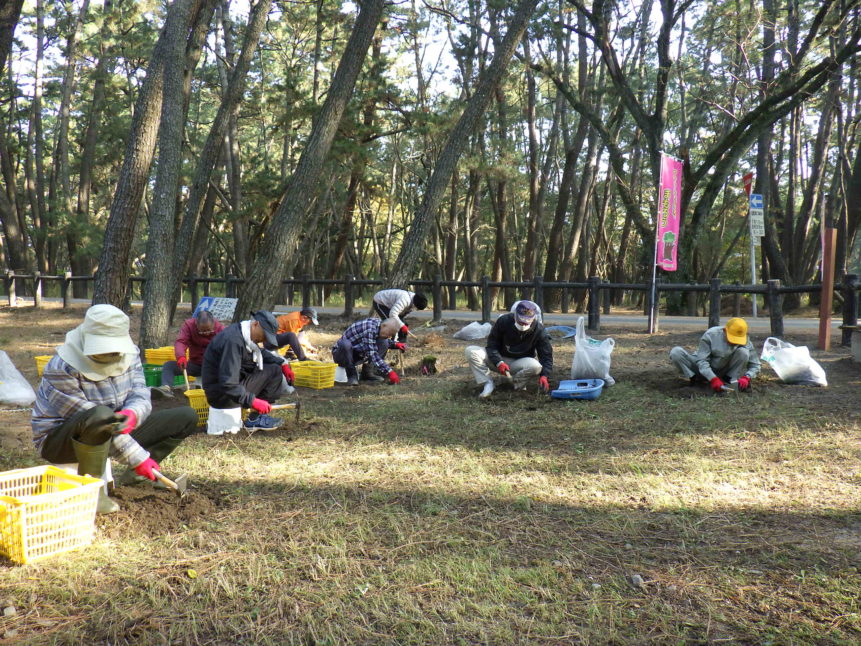 毎週火曜の朝、虹の松原で増えすぎた植物を根から丁寧に取り除き、未来の松原を守る活動です。