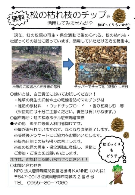 現在、虹の松原の再生・保全活動で集められる松の枯れ枝・松ぼっくりの活用先に困っています。