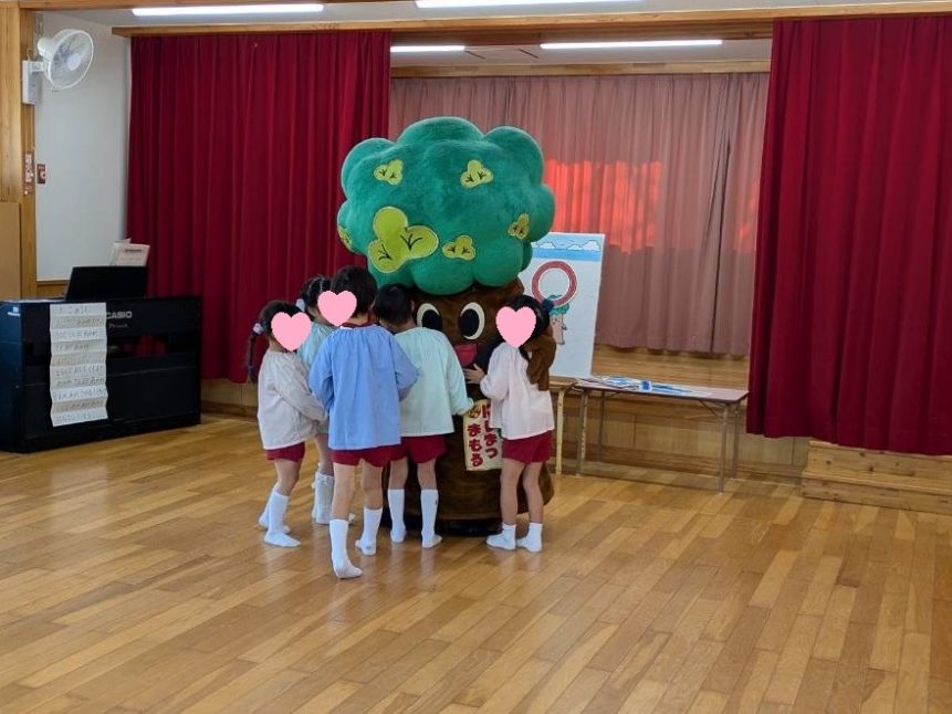 出前学習では、まずパネルシアターを使って虹の松原についてのお話をし、そのあとに「虹の松原クイズ」、最後は「虹松まもるくん音頭」をみんなで楽しく踊ります♪
