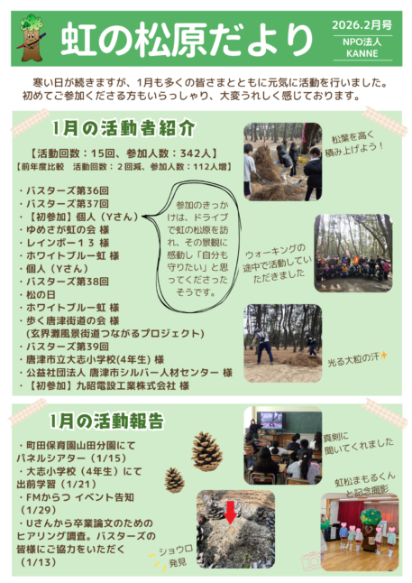 虹の松原だより2026年2月号 ダウンロードはこちらから https://npokanne.com/wp-content/uploads/2026/02/虹の松原だより2026年2月号.png npo-kanne-editor2026-02-18T16:03:53+09:002026/02/18|Categories: 虹の松原再生保全活動| あなたのSNSでシェアをお願いします。 FacebookXTumblr電子メール