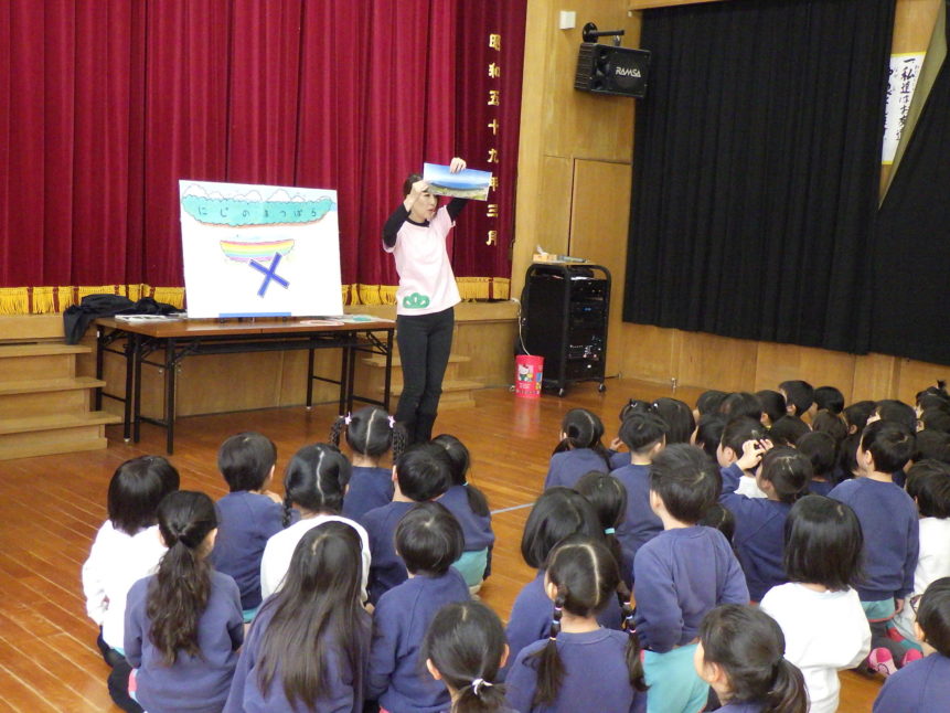 0歳さんから年長さんまで、みんながしっかり聞いてくれて、松を植える場面では一緒に参加してもらいました。