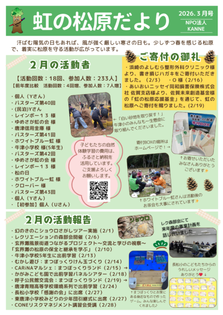 松原だより3月号 npo-kanne-editor2026-03-04T10:32:52+09:002026/03/04|Categories: 虹の松原再生保全活動| あなたのSNSでシェアをお願いします。 FacebookXTumblr電子メール