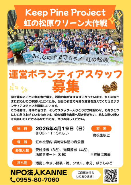この活動は、地域の皆さま、そしてスタッフ一人ひとりが力を合わせ、心をひとつにして創り上げているものです。虹の松原を未来へ引き継ぎたい、そんな熱い想いを共有してくださるあなたの力を、ぜひお貸しください。