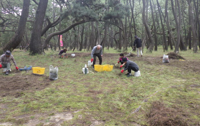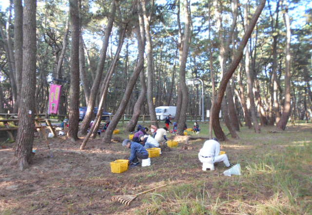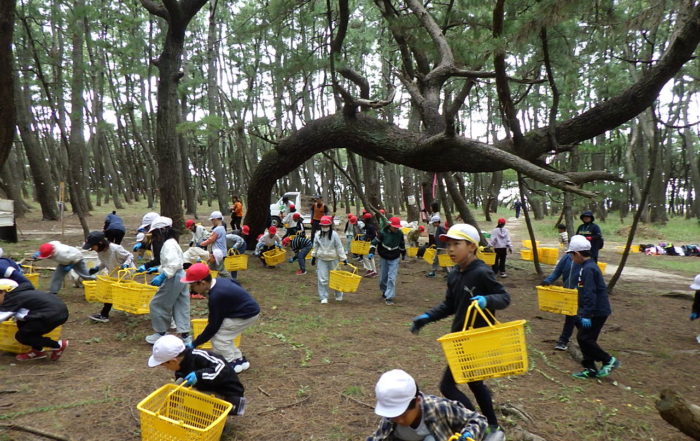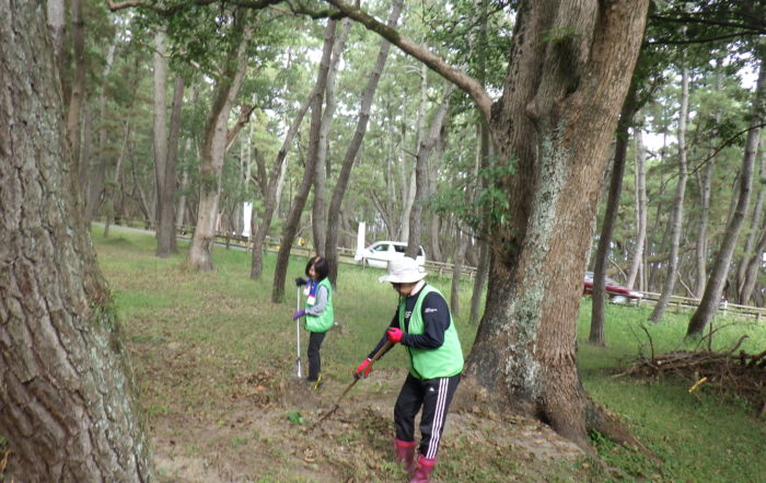しかし、1960年代ごろから人々の生活様式の変化により、松葉の採取が行われなくなり、林地が富栄養化したため広葉樹が繁茂していきました。また、松くい虫による松が枯れる被害も年々深刻化している状態でした。そこで多くの課題を解決し、白砂青松の姿を取り戻すべく、ボランティアによる松葉かきや除草作業等が2009年度からはじまりました。