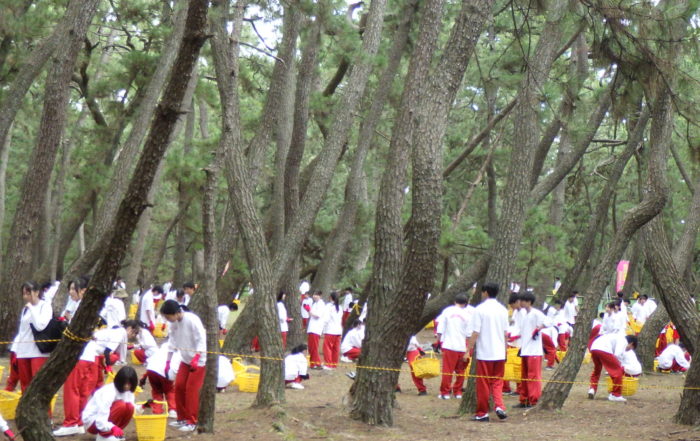 しかし、1960年代ごろから人々の生活様式の変化により、松葉の採取が行われなくなり、林地が富栄養化したため広葉樹が繁茂していきました。また、松くい虫による松が枯れる被害も年々深刻化している状態でした。そこで多くの課題を解決し、白砂青松の姿を取り戻すべく、ボランティアによる松葉かきや除草作業等が2009年度からはじまりました。